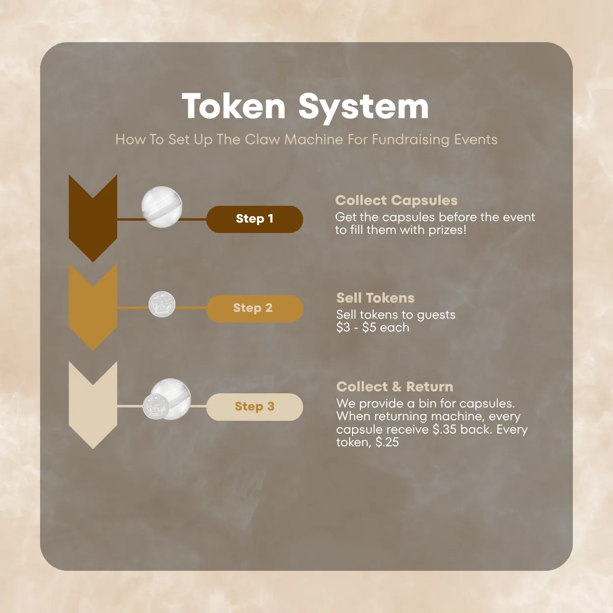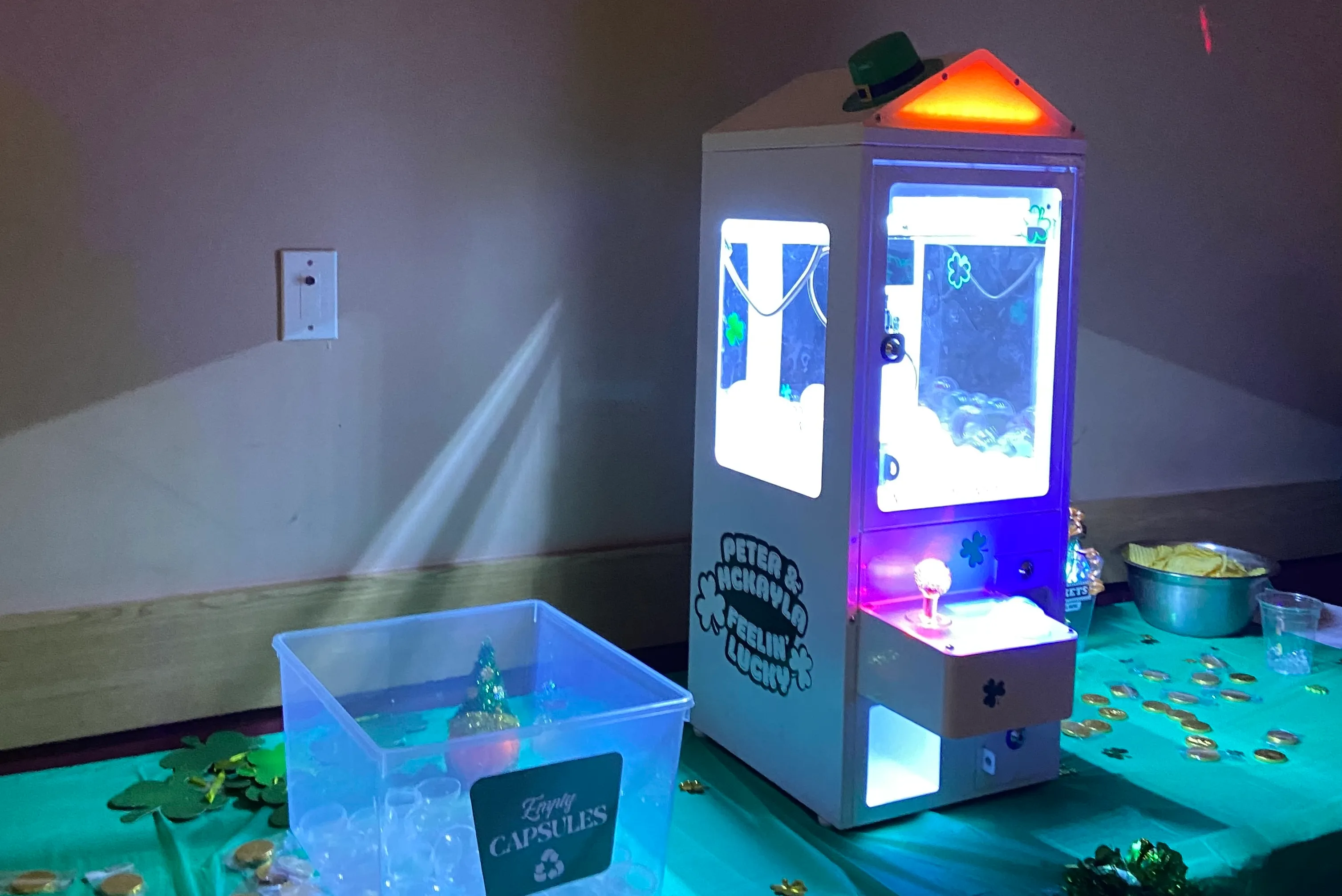 We recommend having a volunteer at the machine all night. Keep it loaded to around 50 capsules for the best gameplay, and make sure guests drop their empty capsules in the return bin. It matters more than you'd think — every capsule returned gets you $0.35 back, every token gets you $0.25. We e-transfer the refund once everything is back with us. The more you recover, the lower your actual cost.