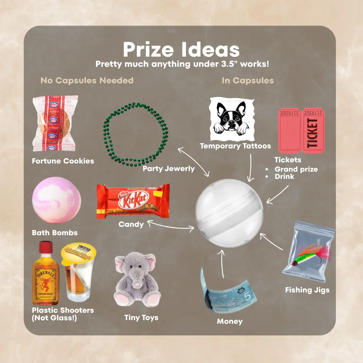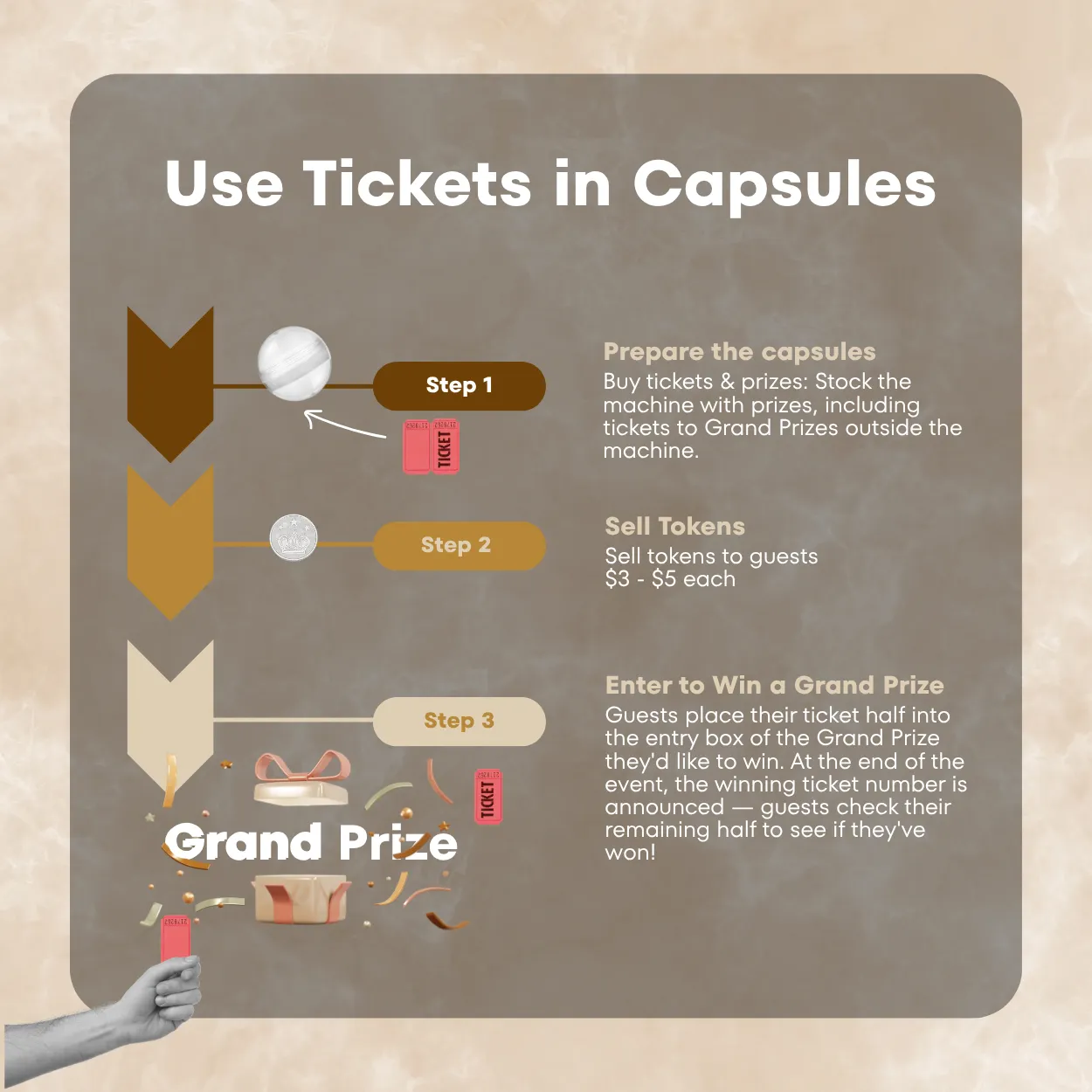 Here's an easy way to keep your costs down without guests feeling shortchanged. A grand prize ticket inside a capsule costs you nothing — but the person who wins it doesn't see it that way. They see a shot at something big. That's the value of the machine working for you.